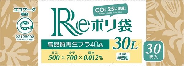 再生原料を40%使用し、エコマーク認証を受けたポリ袋です。再生原料を使用することで生産時に排出される二酸化炭素を約25%削減!エコマーク認証を受けている為、グリーン購入法にも対応しています。