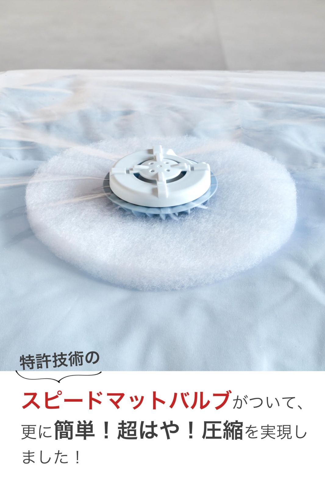 【スピード圧縮セット】電動吸引機エアッシュと、専用バルブ搭載の布団圧縮袋セットです。一緒に使うことでスピード圧縮を実現。圧縮袋は空気の戻りなし&ロック不要のオートバルブ式です。