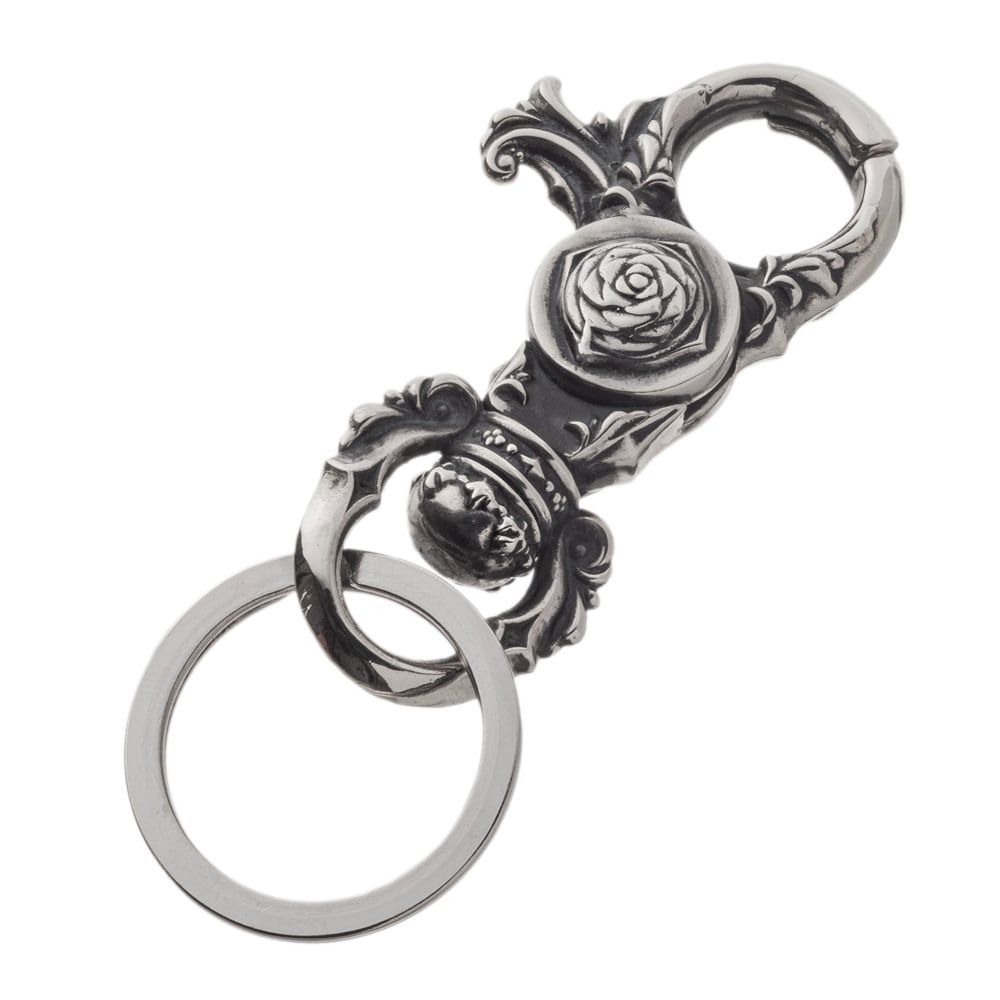 A weighty snap hook, intricately carved with roses and arabesque scrolls. The mirror-polished surfaces and softly oxidized recesses create rich depth and shadow, giving this compact piece a commanding presence in the hand. Below the clip, a 360° swivel keeps keys from twisting or tangling, while the generous key ring makes adding or organizing keys effortless. Hook it to a belt loop or bag to lend a refined flourish to everyday carry.