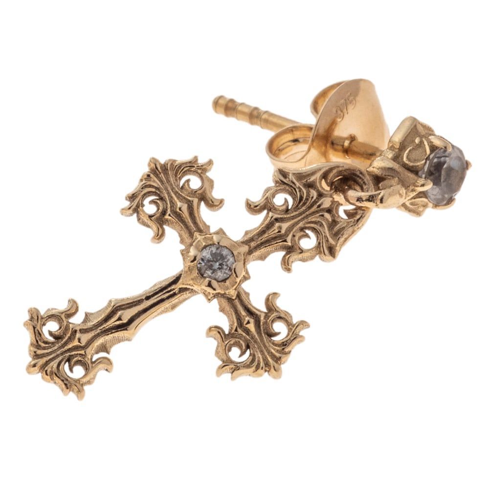 Flagship-exclusive drop cross earring, cast in solid 9K gold. The honey-toned metal frames a finely engraved cross, its center set with a lucid natural diamond while the stud is tipped with radiant white topaz. The petite, elongated silhouette sways softly and catches the light with refined sparkle—elegant yet understated. Designed to be worn by anyone, it slips effortlessly from casual days to evening tailoring. Under the brand’s direction, our partner atelier brings the piece to life with exacting savoir-faire (master craftsmanship); the reverse is hallmarked with the brand signature and 9K stamp. Worn solo, in a single-ear look, or layered with other studs, this is a discreet art piece that quietly elevates every ensemble.