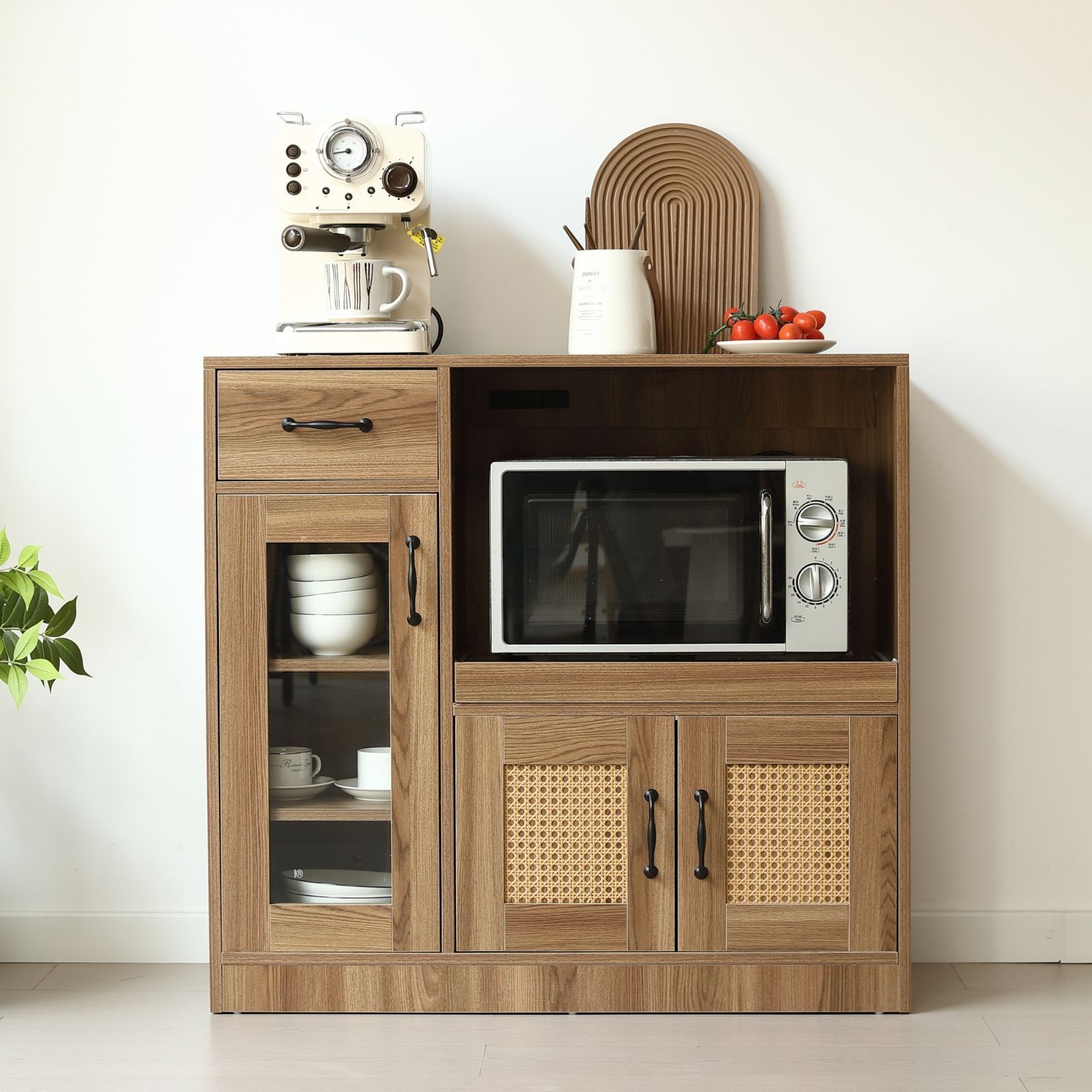 x キッチンカウンター 食器棚 キッチンキャビネット レンジ台 キッチン収納 幅88 cm ラタン調 引き出し付き 組立品 扉付き スライドレール ロータイプ キッチンラック レンジボード 収納 ガラス コンパクト BROWN