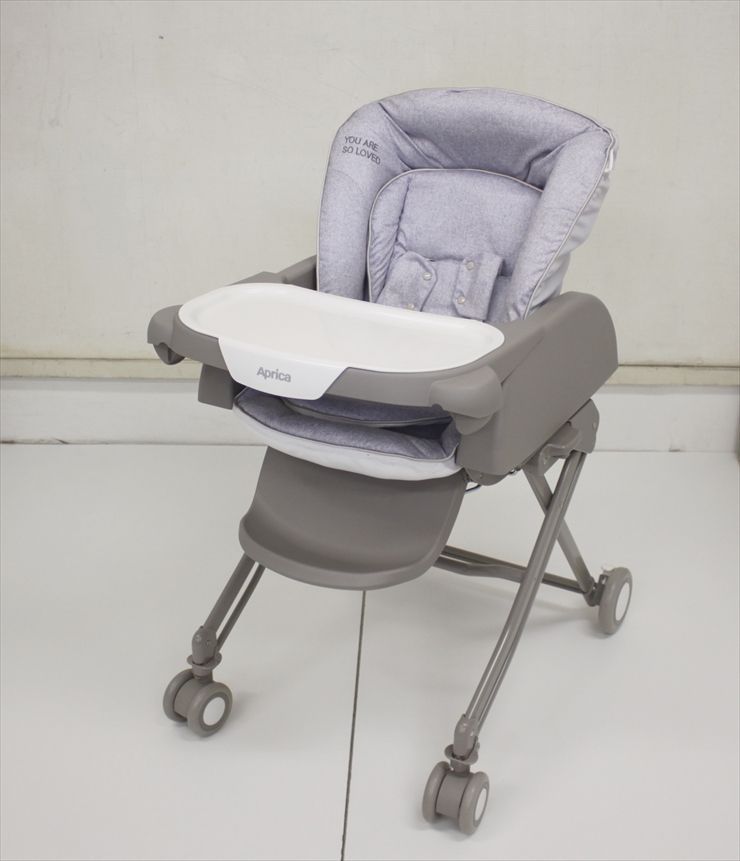 アップリカの手動タイプのハイローチェアです。キャスター付きでラクラク移動、6段階の高さ調節でどこでも使いやすくてとても便利です。さらに、低月齢時のお世話やお昼寝ができる簡易ベッドとしてのご利用後、4歳頃までお食事イスとしてもご利用いただけます。こちらのプレミアムモデルは、通常のテーブルの上に取り外し可能な洗えるトレイ付きですので、離乳食期にも便利です。