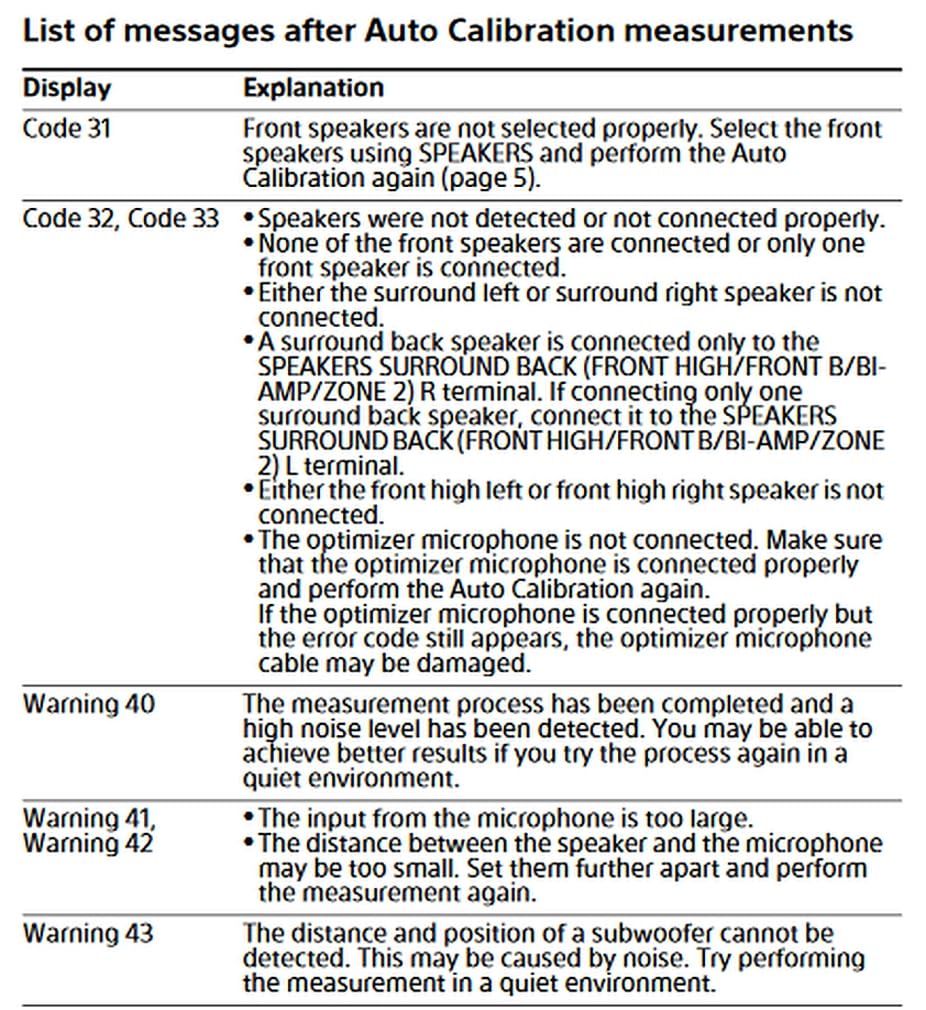 フロントスピーカーとサラウンドスピーカーやマイクが正しく接続されていない場合、自動キャリブレーション処理が失敗する場合があります。Sonyキャリブレーション測定マイクは、ほとんどのSonyレシーバーと互換性があり、正しいスピーカー出力レベルを調整できます。互換性のあるSonyレシーバー(約150モデル)のリストについては、下にスクロールして下記の製品説明をご覧ください。(画像2)では、自動キャリブレーションに失敗した場合の一般的なエラーコードを示しています。
