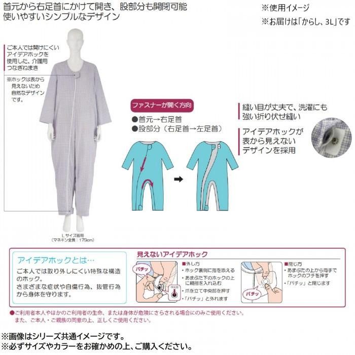 ご本人では開けにくいアイデアホックを使用した介護用つなぎねまき。アイデアホックが表から見えないデザインを採用しています。縫い目が丈夫で、洗濯にも強い折り伏せ縫い。首元から右足首にかけて開き、股部分も開閉可能です。(※フドーねまきは、おむつ・おむつカバーを使用して着用することを想定しています。) 生産国:中国 素材・材質:綿68%、ポリエステル32% 商品サイズ:身長:180~190cm、胸囲:112~120cm、ヒップ:102~110cm 仕様:スリーシーズン対応
