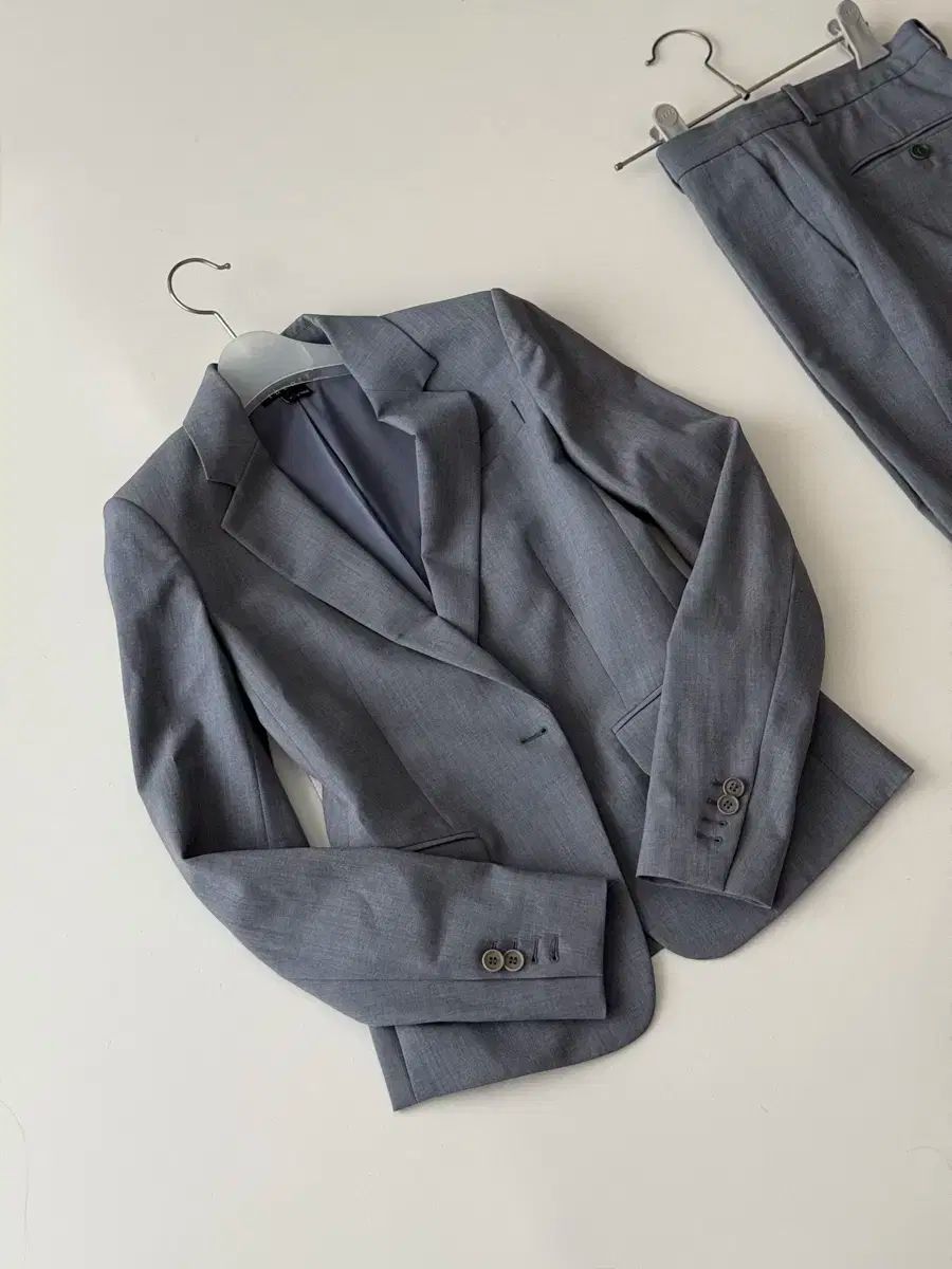 色はグレーで、ブレザーとパンツで構成されています。