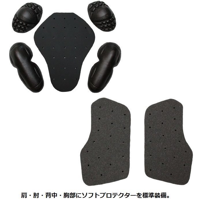 ・肩/肘/脊髄には標準仕様でプロテクターが装備されています。さらに事故で一番ダメージを受ける胸部にも標準でプロテクターが装備されています。