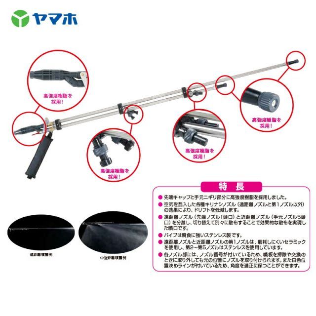 ●遠距離ノズル(先端ノズル1頭口)と近距離ノズル(手元ノズル5頭口)を分離し、切り替えて別々に散布することで効果的な散布を実現した噴口です。