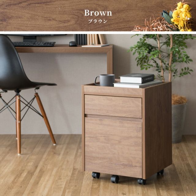 深さの異なる二つの引き出しはA4ファイルも収納できるサイズ。天板は囲いがあり書類やマグカップの落下を防げます。キャスター付きで移動もラクラク。