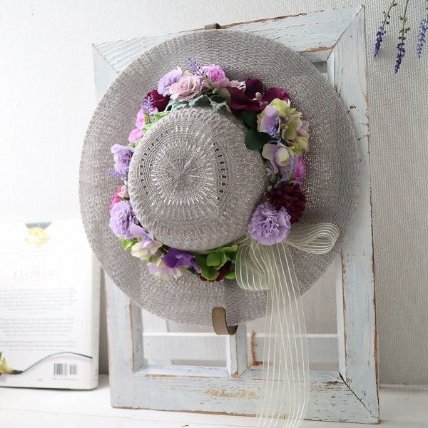 グレイッシュな色合いのハットに、パープルやピンク系のアーティフィシャルフラワーをたっぷりとあしらった、華やかなフラワーハットです。