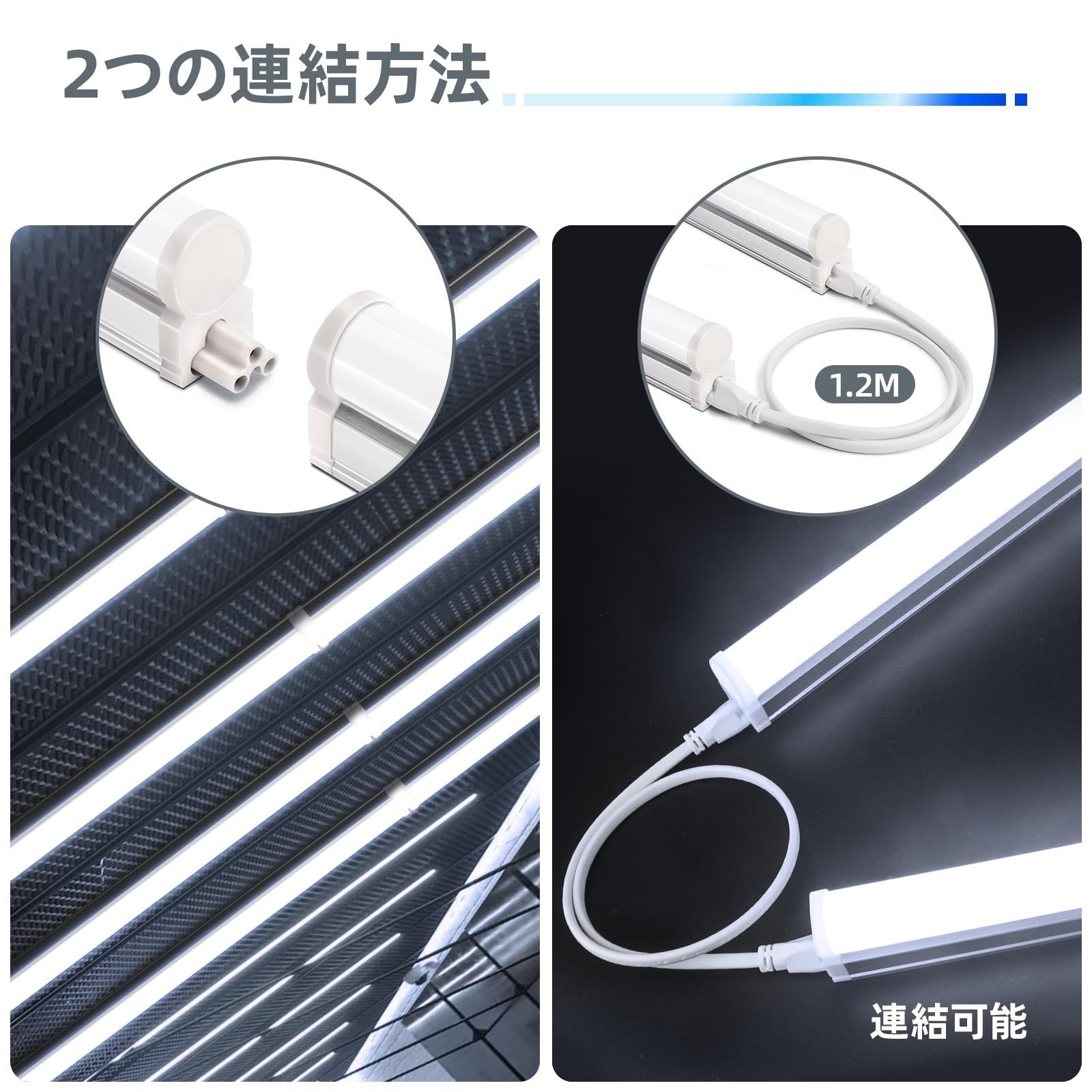 拡張性のあるデザイン:この照明器具蛍光灯は、シームレスコネクターまたは1.2mのケーブルで最大6本まで直列に接続することが可能です。1.2mケーブルは設置場所に応じて使い分けが可能です