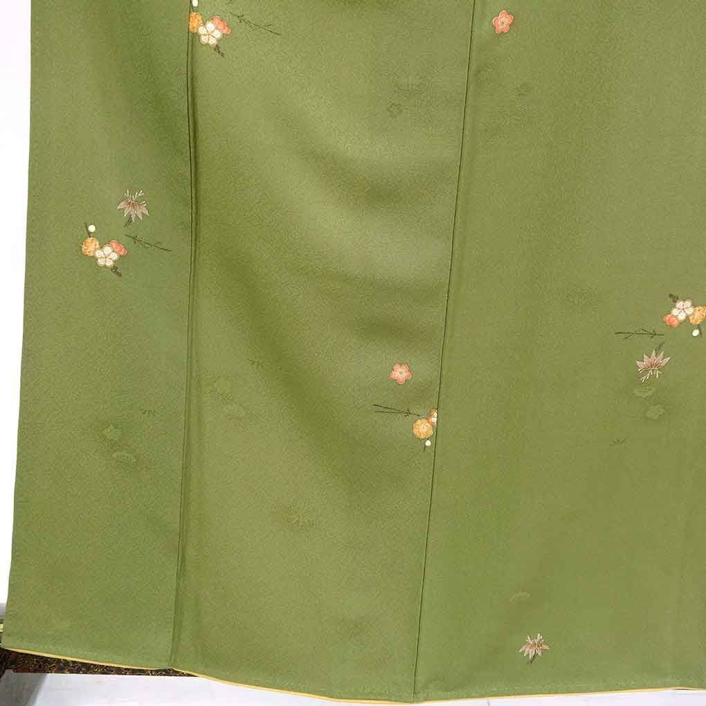 正絹のちりめん地の袷小紋着物です。落ち着いた抹茶地に花柄の飛び柄でカジュアル用途の着物に合わせてお使いいただけます。身長156cm-166cm程度、やや細身から標準体型の方にお勧めサイズです。広衿仕立て。裄の縫い代は2.5cm程度ありそうです。