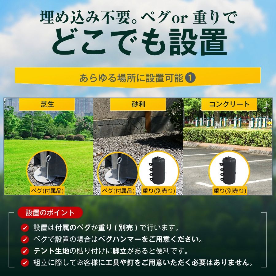 車・自転車・バイクの屋外用ガレージです。テント素材は防水・UVカット。風や雨、黄砂や紫外線から守ります。建築許可も不要で、自分で組み立てられます。簡単な設置と撤去が可能で、移動や収納に便利です。前幕と後幕は取り外し可能です。自宅用や農業工業用の倉庫。バーベキューやキャンプ、防災用テント。好きなスタイルでさまざまな用途に使用可能です。設置面がコンクリートでも設置可能なのでご安心ください。