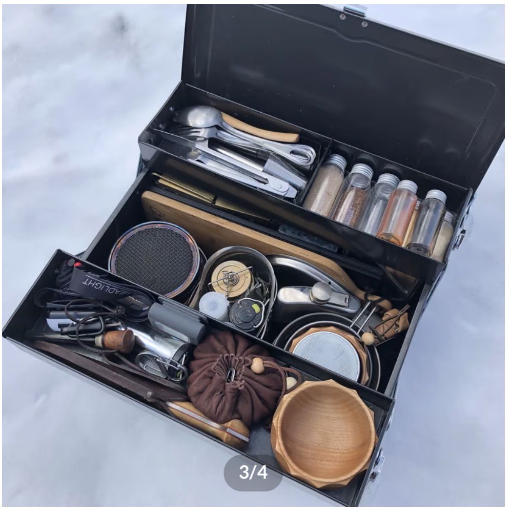 お気に入りのシェラカップ やカッティングボード含めフィールドホッパーやLEDライトなどすぐに出せてワンアクションで展開出来るギアケースです。