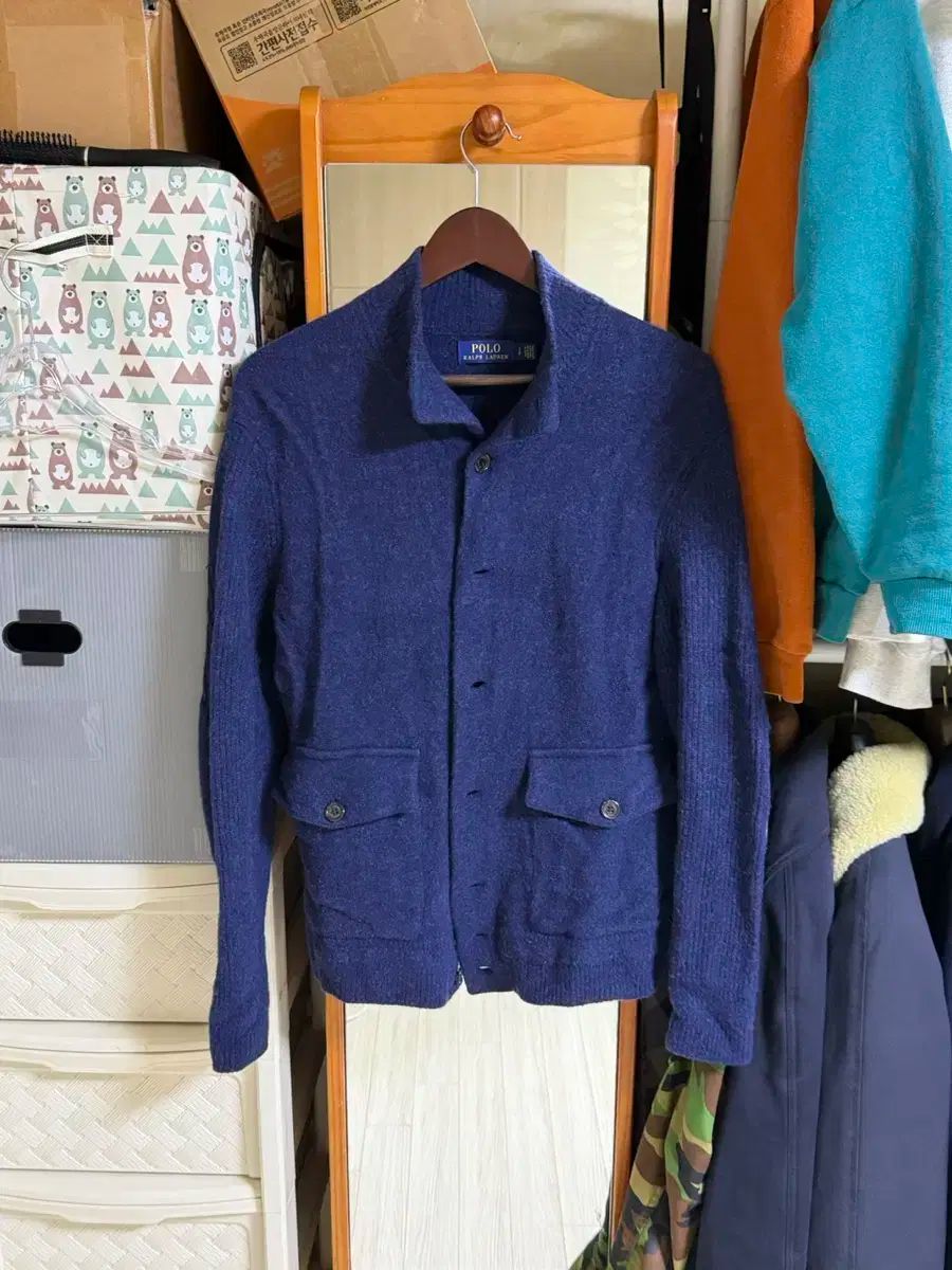 ポロ ウール カシミア ブレンド ネイビー エルボー パッチ カーディガン 95