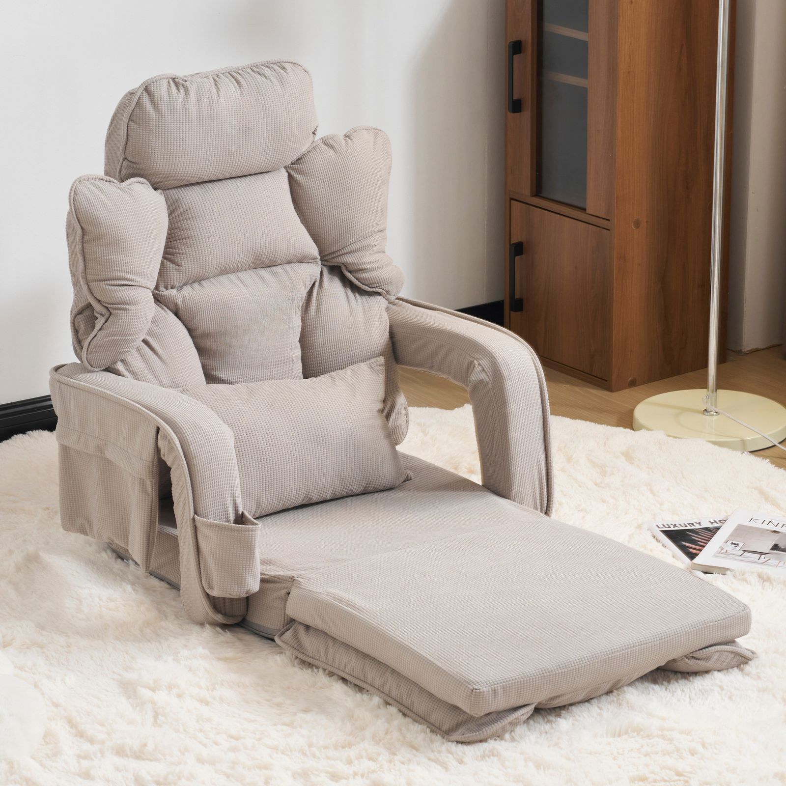 【多機能で使い勝手の良さ】ニーズに合わせて形を変えられ、快適な座椅子として使用できるだけでなく、最大 165CM のベッドにも広げられます。座る、横になるといった様々なシーンのニーズに応え、実用性に優れています。特に小さな部屋の空間に最適で、座椅子からベッドへの機能変換を実現します。