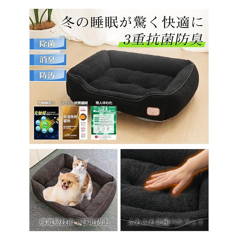 『3重抗菌防臭&清潔さと寝心地を両立!』究極の暖かさ・快適さ・清潔さを追求した温感「猫犬 ベッド 冬用」です!『帝人マイティトップECO』中わたを使用し、高い忌避効果でダニを寄せつけにくくします。また、細菌の増殖を抑制し、抗菌防臭効果を発揮します。コーヒー炭素繊維は、臭いを吸収して消臭する天然の消臭剤です。光触媒は、太陽光や蛍光灯などの光に反応し、含まれる酸化チタンがイオン吸着力と強力な酸化力を発揮します。これにより、有害物質を無害化・分解し、増殖を抑える環境浄化技術です。毎日、極上の睡眠をお楽しみください。