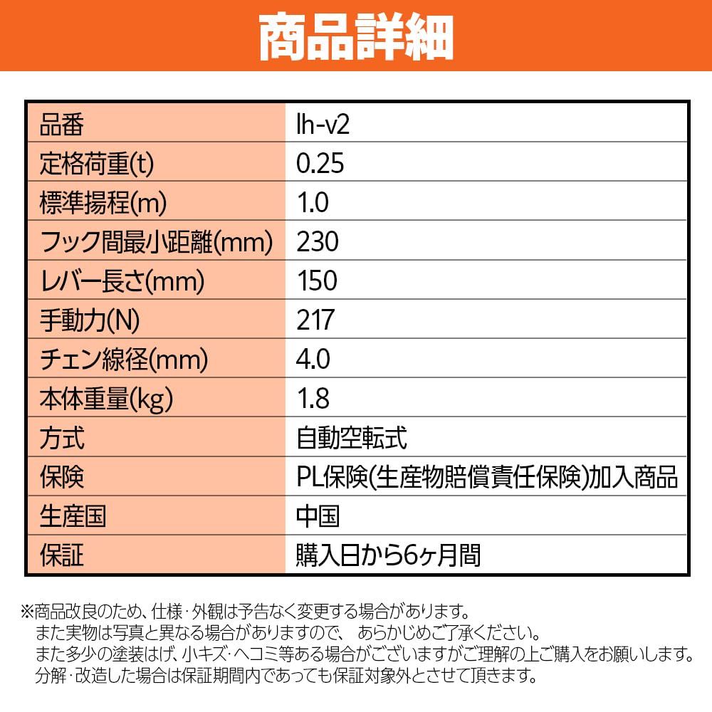 品番:lh-v2 ●定格荷重(t):0.25 ●標準揚程(m):1.0 ●フック間最小距離(mm):230 ●レバー長さ(mm):150 ●自動空転式 ●手動力(N):217