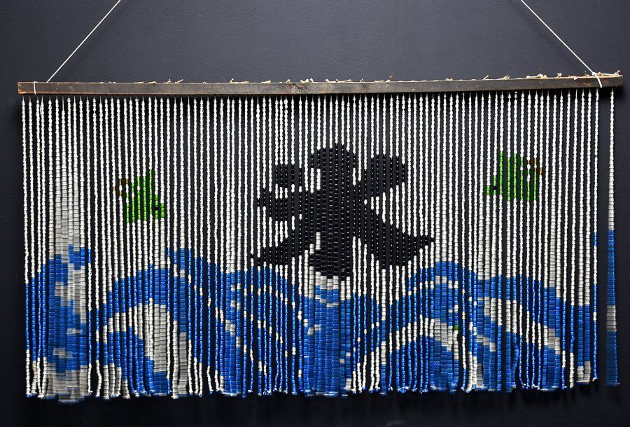 蔵A 5593 b レトロ ガラスビーズ暖簾 波千鳥の氷 古硝子 大正~昭和初期