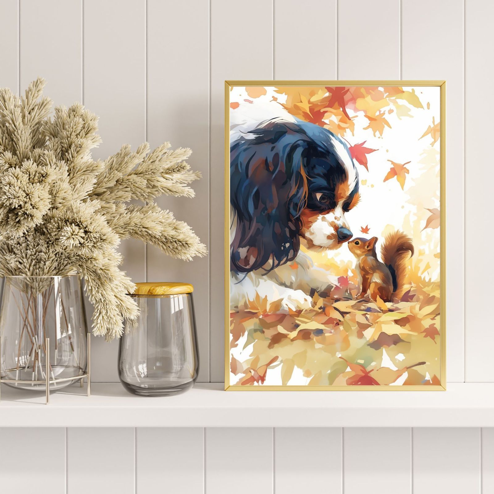 紅葉の秋に栗鼠(リス)と戯れるキャバリア・キングチャールズ・スパニエル犬の子犬の姿が可愛すぎるアートポスター作品です。