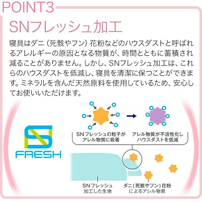 しかし、SNフレッシュ加工は、これらのハウスダストを低減し、寝具を清潔に保つことができます。