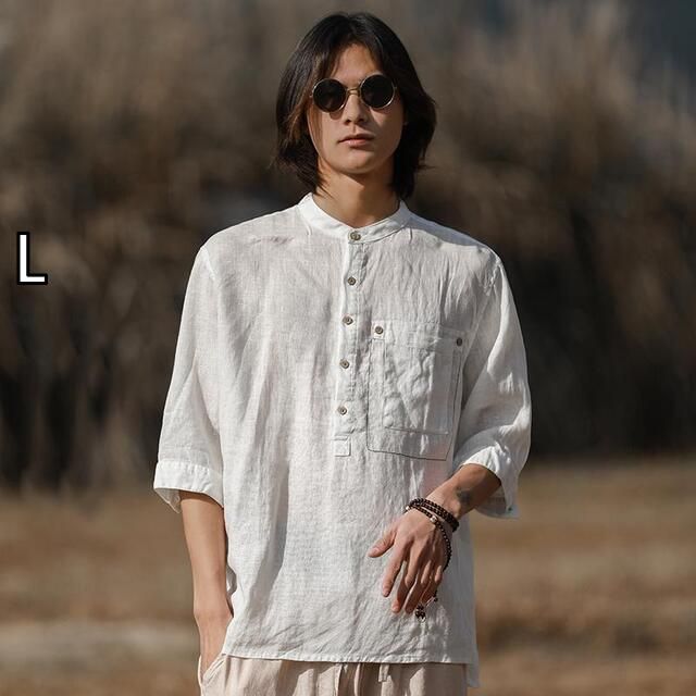 L メンズ ファッション 服 男性用 オシャレ シンプル 大人 かっこいい 大きいサイズ ストリート 紳士服 スタンド リネン シャツ 五分袖 カンフー 唐 スーツ 綿 カジュアル 夏