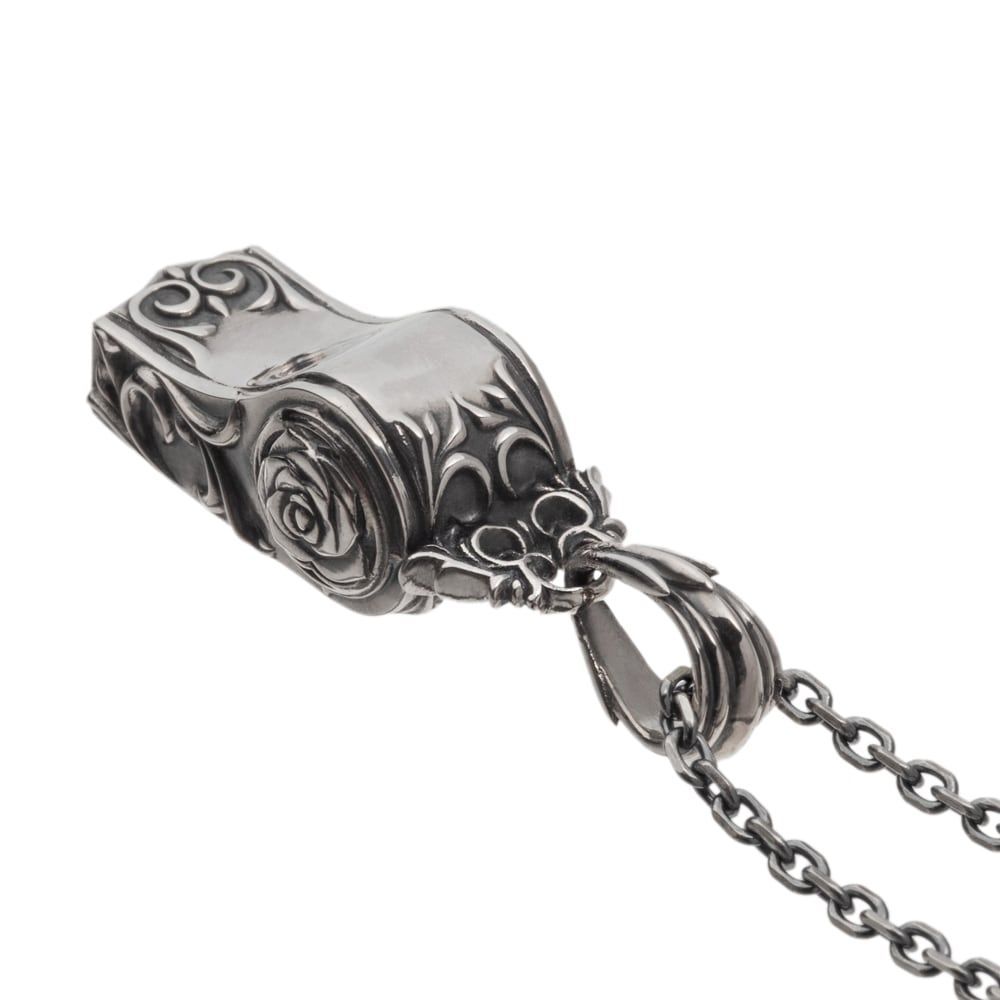 人気のホイッスルを、日常に寄り添うミニサイズへと凝縮。ひと吹きで澄んだ音が鳴る確かな実用性に、鏡面×燻しのコントラストと精緻な彫りを重ねた端正なシルエットです。トップから側面に巡る唐草のレリーフが光を拾い、胸元に上質な陰影を描写。いざという時の合図に役立つ護身・防災性も心強く、普段はアクセサリーとして凛とした存在感を放ちます。監修の視点と匠の技を重ね、提携アトリエで完成度を高めたプロダクトです。背面にはブランドロゴと“925”の品質刻印。ローズシリーズとのレイヤードはもちろん、ペンダントの大サイズのホイッスルとサイズ違いのペア使いもおすすめ。ジェンダーレスに映える、機能と美を兼ね備えたモダン・アートピース。※ペンダントトップのみ(チェーン別売り)。