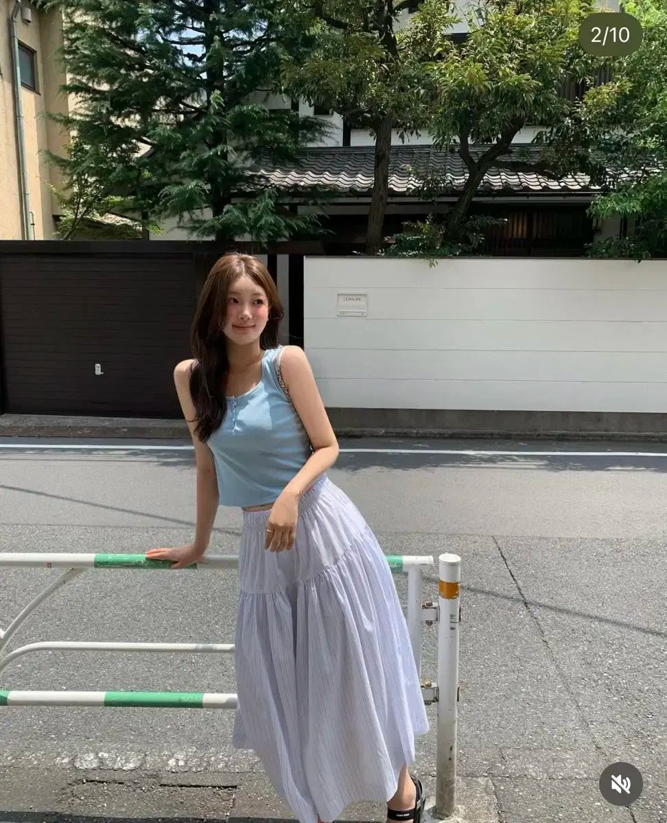 ondemin ローニー ロングスカート ストライプ ボタン スリーブレス ブルー
