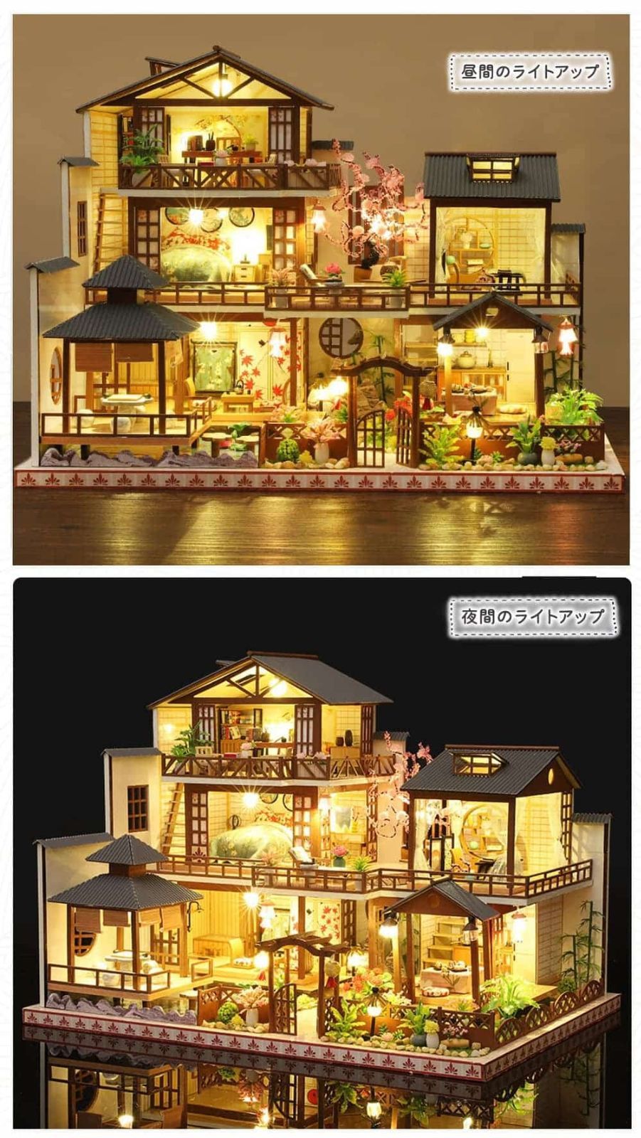 moin moin 1/24 ドールハウス ミニチュア 手作りキット セット 【 英語説明書 】 森の中の 別荘 和風 ヴィラ 豪邸 三階建て 邸宅 日本庭園 | LEDライト + アクリルケース + オルゴール 2204dh319