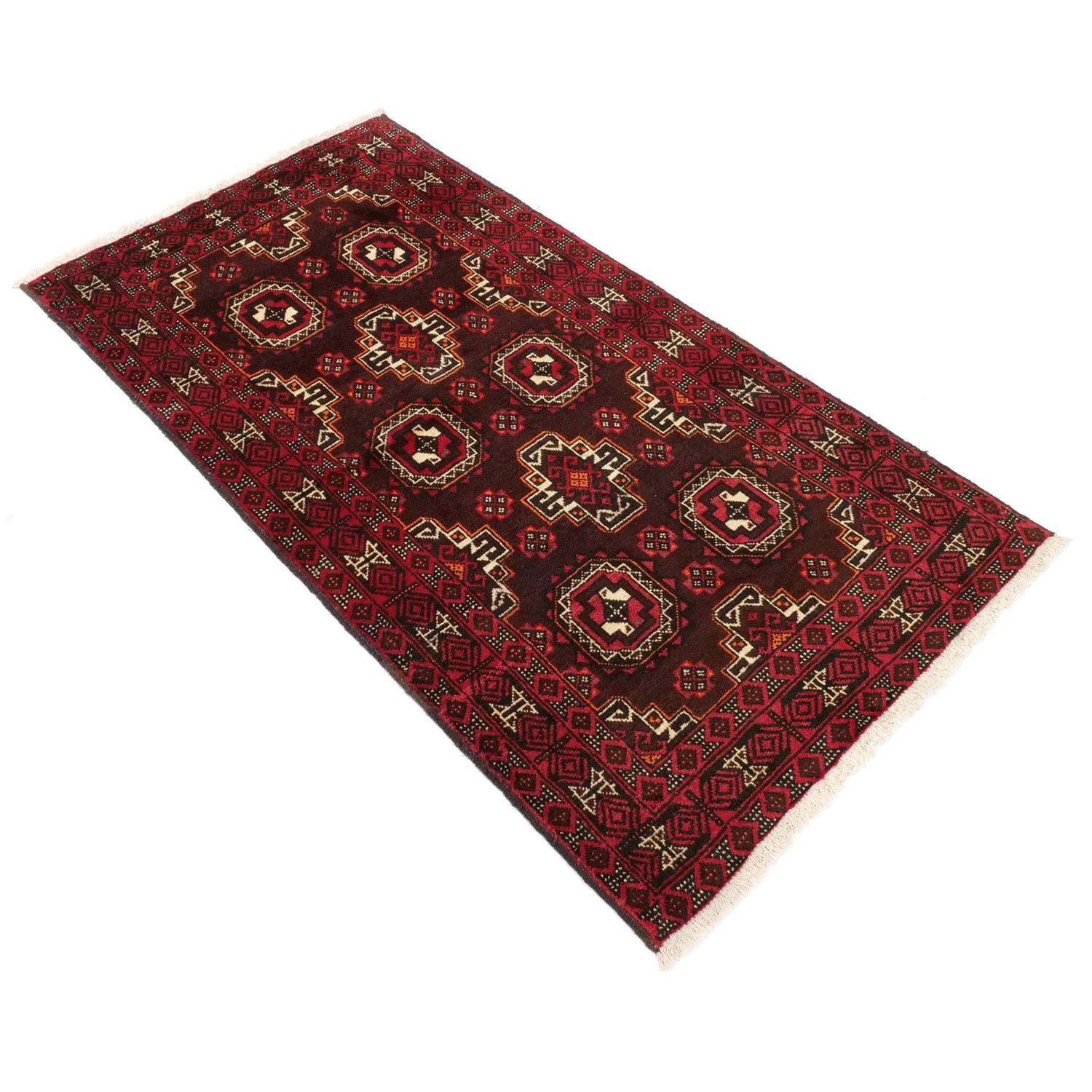 1970年代に織られたバルーチ産のセミアンティークラグです。力強いフックモチーフが連続し、古来より守護や魔除けを意味する伝統意匠として伝えられています。1800×900mmのサイズはリビングやベッドサイドに適し、程よい存在感を放ちます。