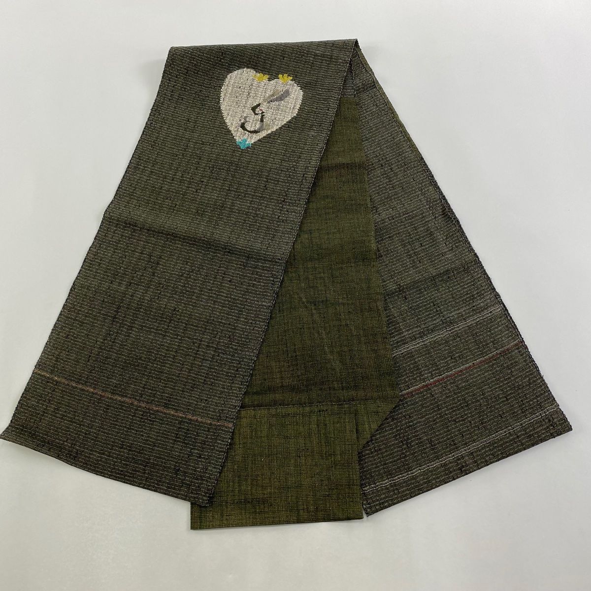 名古屋帯 秀品 八寸名古屋帯 松葉仕立て 鈴乃屋 うさぎ ハート 金糸 茶緑色 正絹