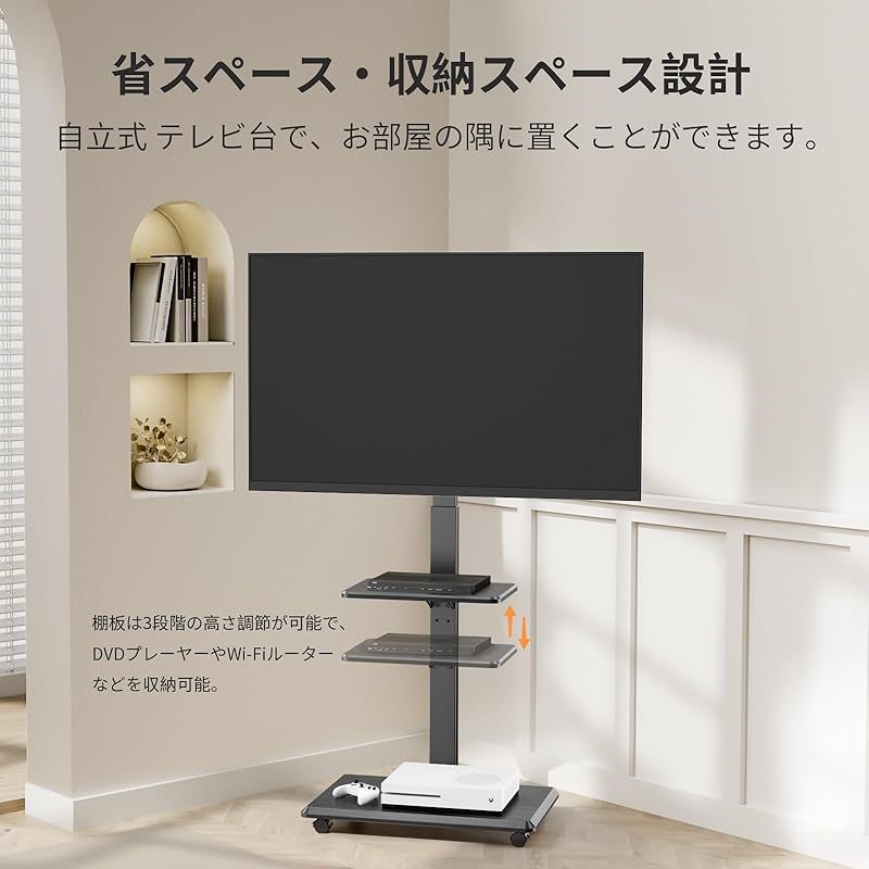 Afaloona テレビスタンド キャスター付き 壁寄せ tvスタンド ハイタイプ テレビ台 収納棚付き 移動式 tv stand 32-75インチ対応 VESA 横75 600 mm 縦75~400 耐荷重50 kg 18段階の高さ調整 左右回転3 0