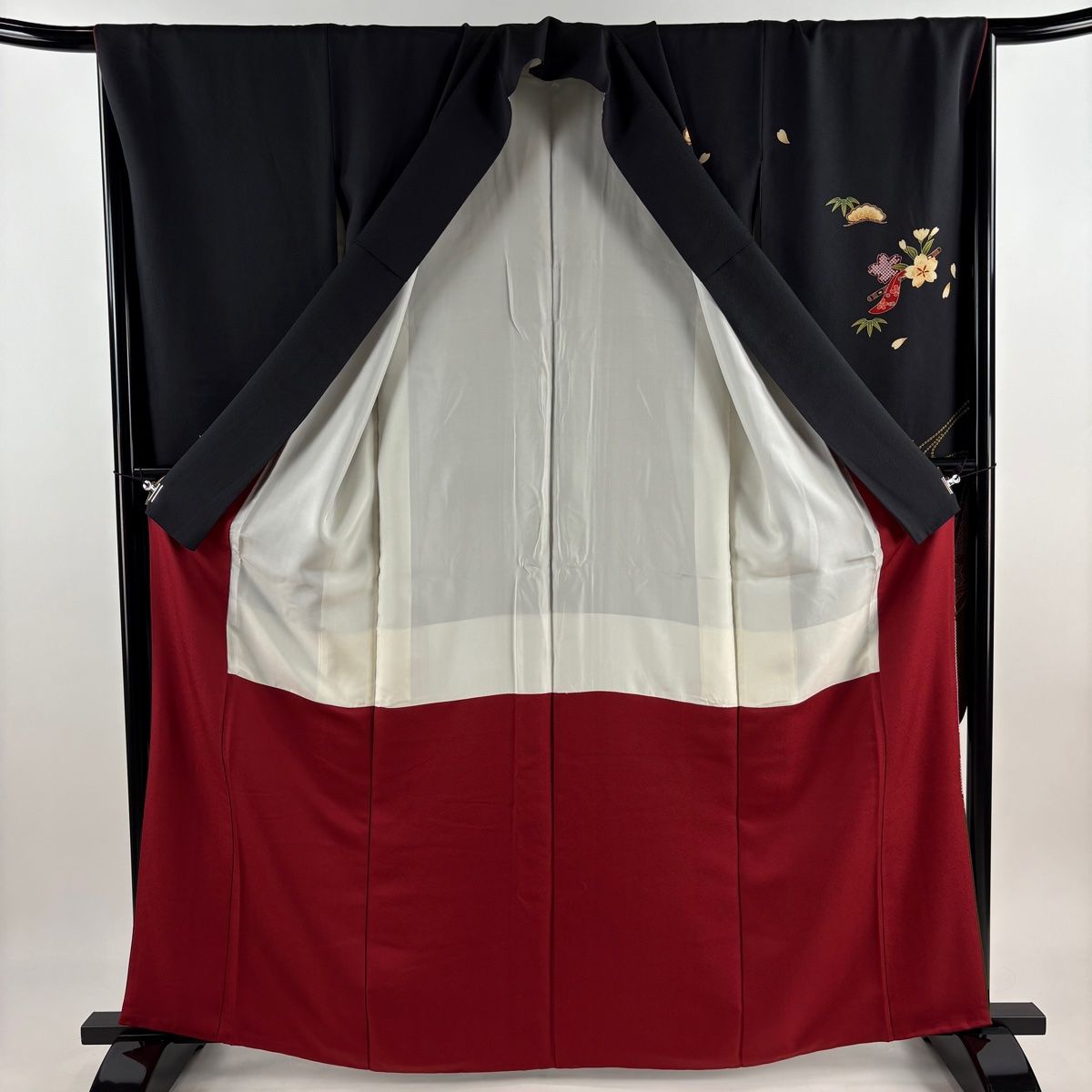 振袖 身丈163 cm 裄丈66.5 M 袷 桜 御所車 金糸 箔 黒 正絹