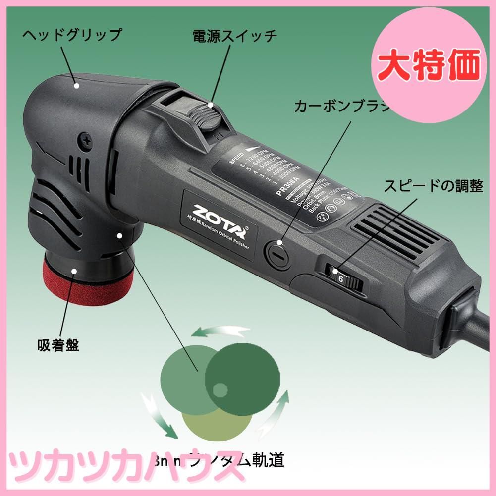 ZOTA ミニポリッシャー50mm/75mmダブル裏板電動ポリッシャー 車,100V六段変速 3000-7200RPM 恒定回転速度ポリッシャー 小型,8mmポリッシャー ダブルアクション,車のディテールや狭いカーブ、ヘッドライトやAピラーの周りの傷に最適です,オートバイに適した小さなエリア。
